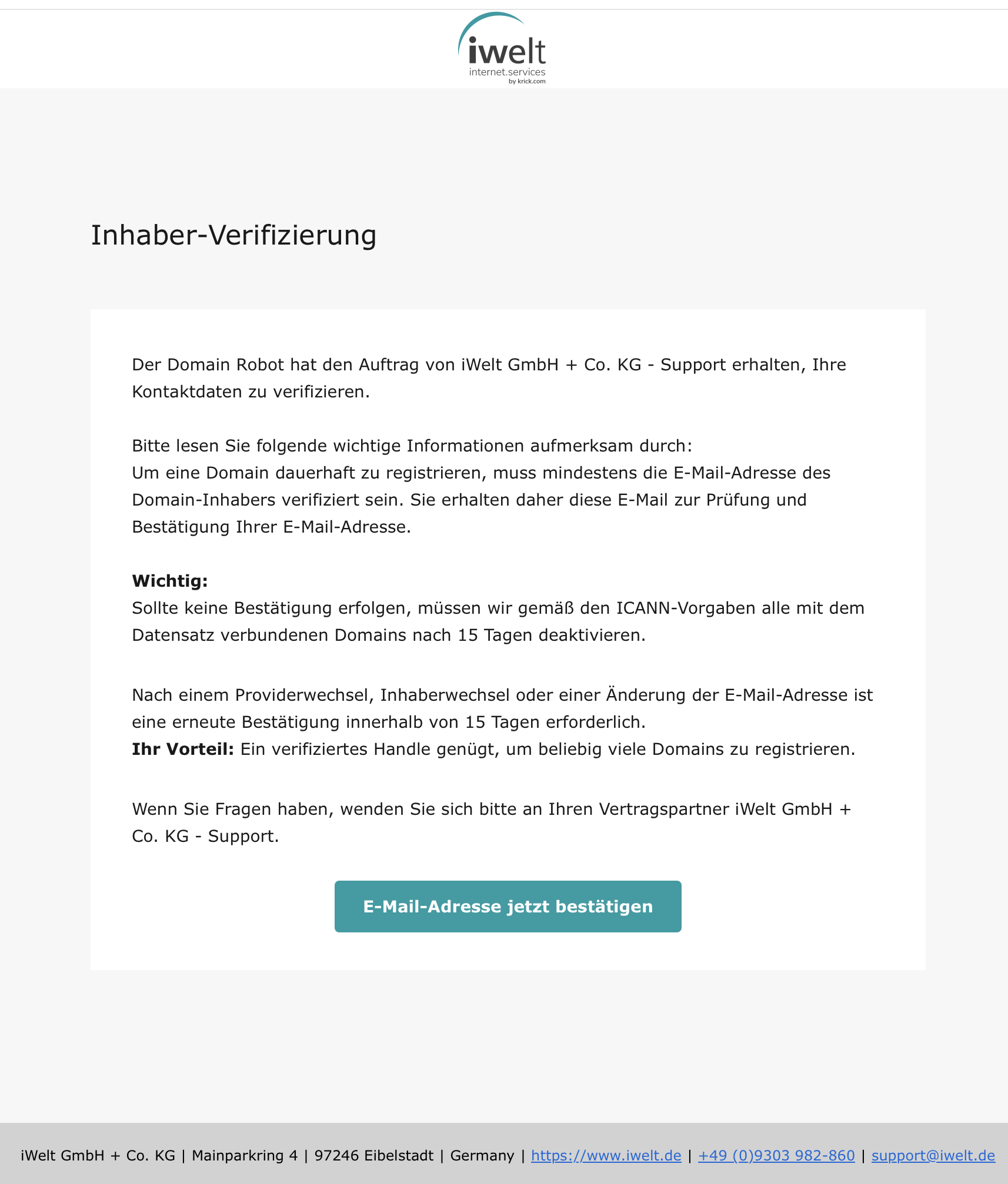 Sie erhalten nach eine der oben stehenden Aktionen eine E-Mail an die im Inhaber-Kontakt hinterlegte E-Mail-Adresse. Nun haben Sie 15 Tage Zeit, die Kontaktdaten per Link zu bestätigen.